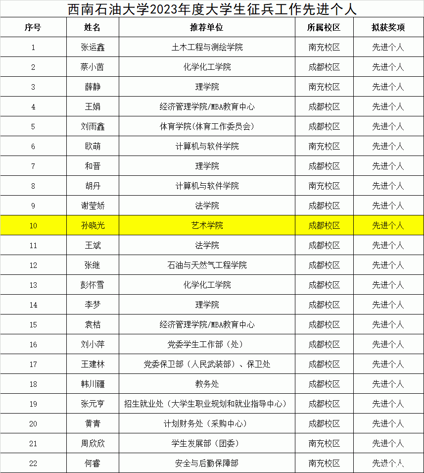 优米体育中心2023年度大学生征兵工作先进个人名单