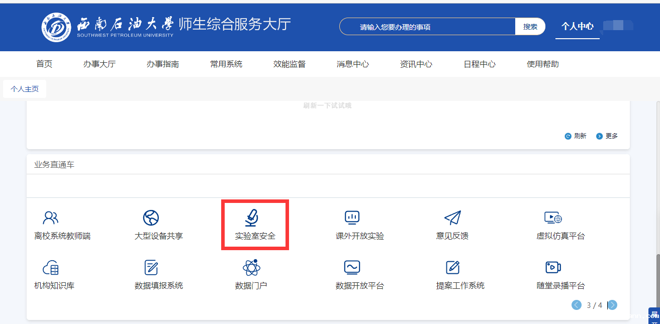 点击服务大厅中的业务直通车中的“实验室安全”功能按钮进入实验室安全培训和考试系统。