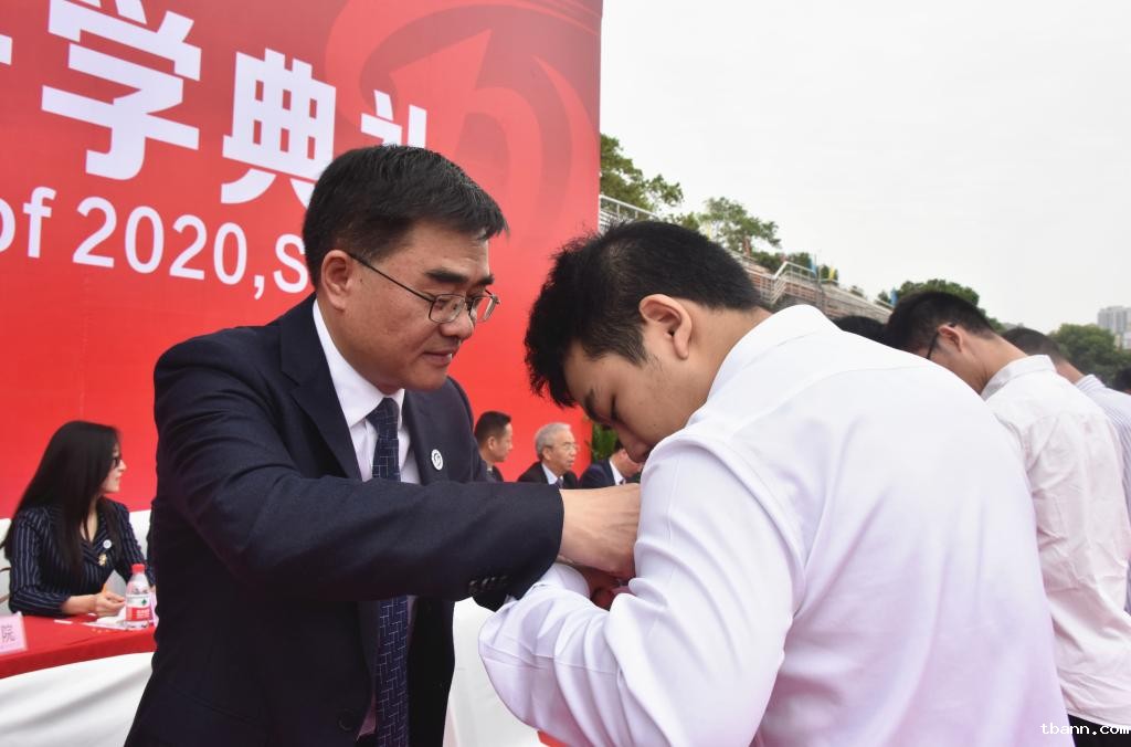 开学典礼仪式上,全体校领导为新生代表佩戴了校徽,2020级全体新生进行入校宣誓。
