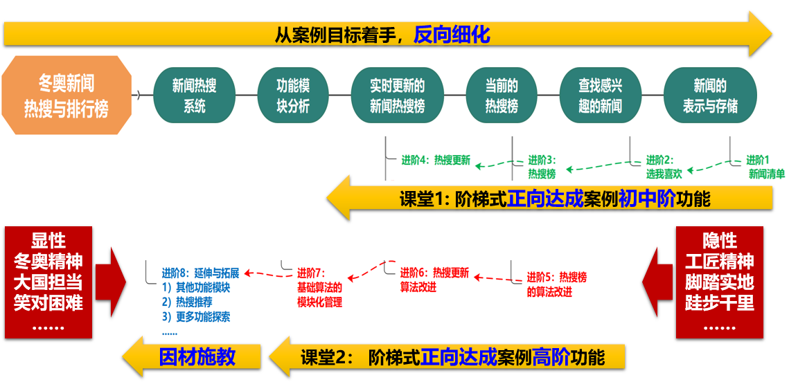 她把这个创新称为“反向细化与正向达成的阶梯式混合教学”。所谓“反向细化”,就是从目标或叫结果出发,对案例功能进行分解,让学生易于下手;所谓“正向达成”,就是让学生在练习中从最基础的功能出发,丰富完善功能,达到最终目标。