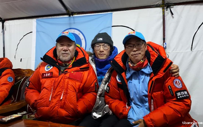 攻顶当日凌晨,王杨(中)与国家登山队队长王勇峰(左)、队员阿贵(右)合影留念