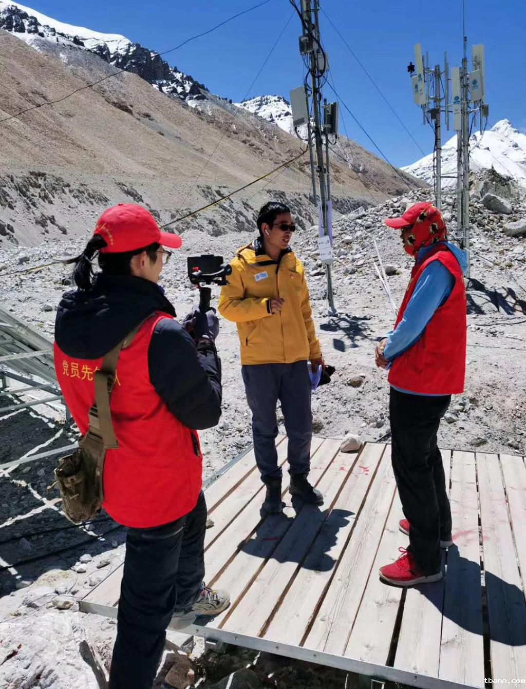 王杨(左一)在位于珠峰海拔5300米处的移动基站前拍摄