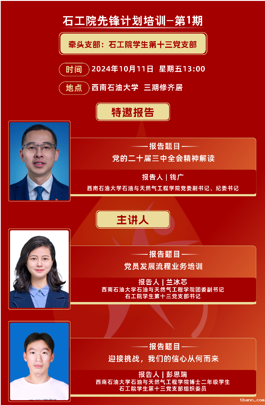 编者按:为深入学习贯彻党的二十大精神,扎实推进立德树人根本任务,落实学校党委关于学生“讲”“赛”“践”专项活动的部署要求,培养青年学子坚定不移听党话、跟党走。自2024年9月以来,石工院围绕党员发展全流程,创新性提出“强国‘油’我·先锋计划”党员培养1+X工程,以涵育学生党性为根本目的,让有信仰的人讲信仰,聚焦校企地多方育人力量,邀请卓越师资、学院领导、朋辈模范等进行分享,培养一批政治素质过硬、思想态度端正、实践水平突出的优秀青年。