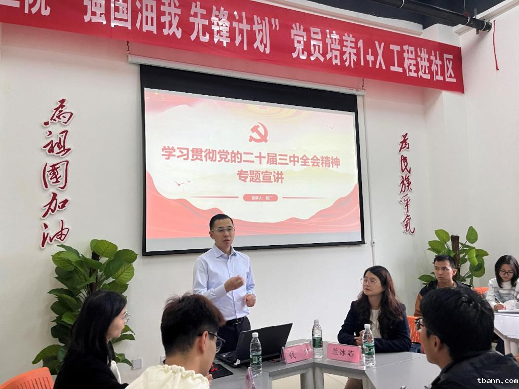 钱广以《学习贯彻党的二十届三中全会精神专题宣讲》为题进行报告,报告中,钱广围绕全会召开的重要性、深入学习领会习近平总书记在全会上的重要讲话精神等进行讲解,阐明了推进中国式现代化的时代背景、历史方位和使命任务,阐释了进一步全面深化改革的指导思想、总目标、重大原则和需要把握的一些重大问题,寄语学院青年学子切实把思想和行动统一到全会精神上来。